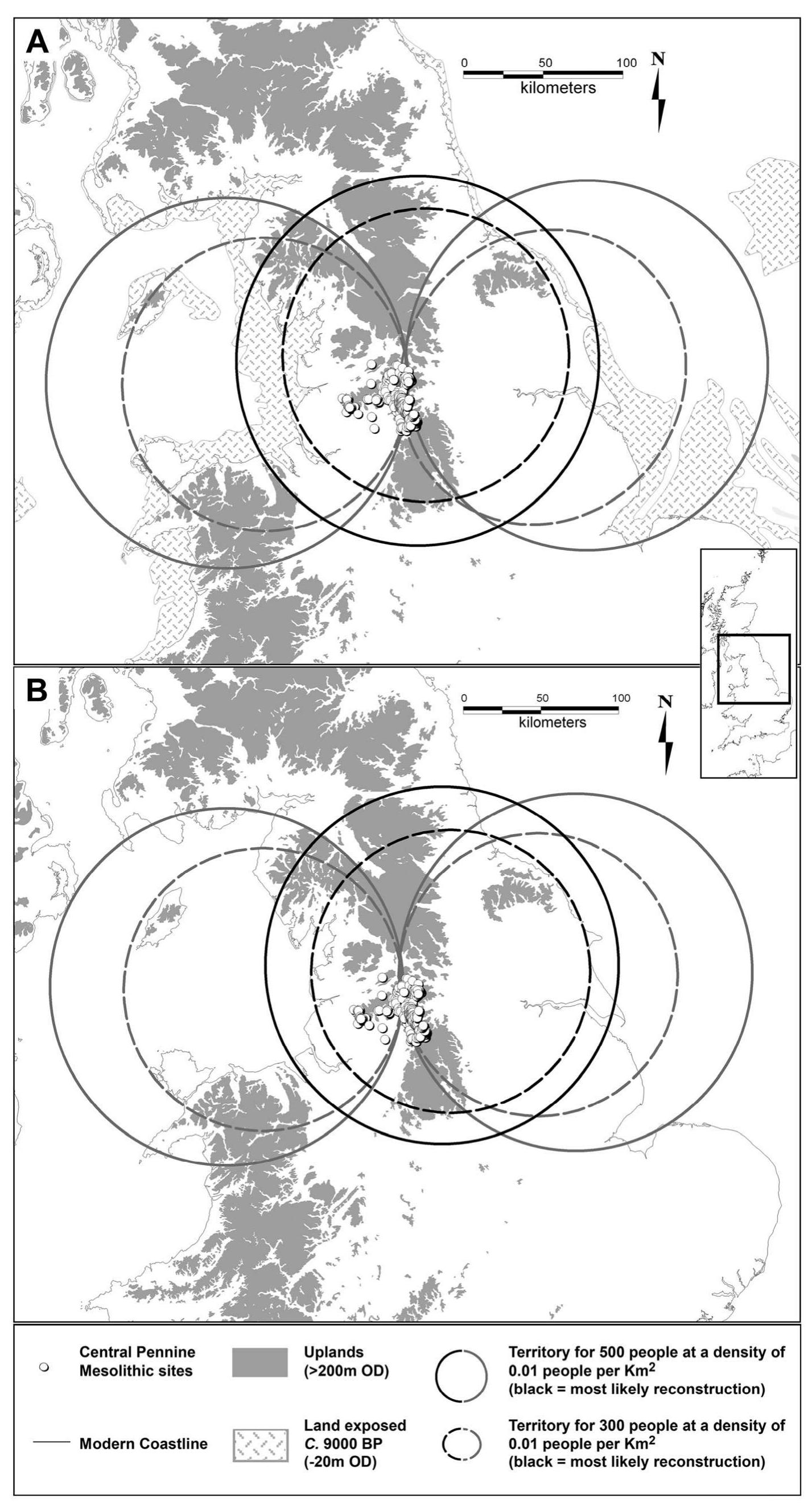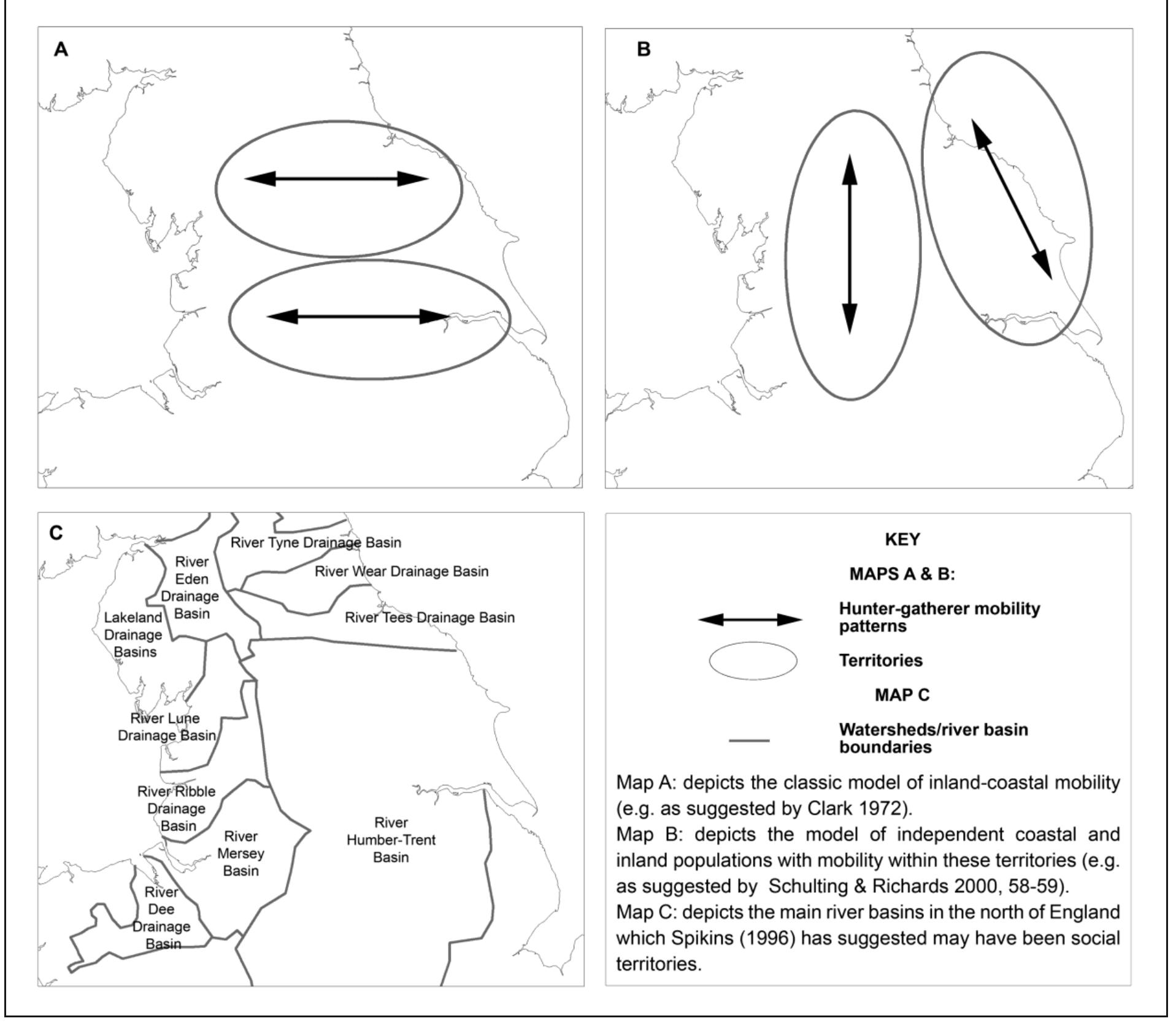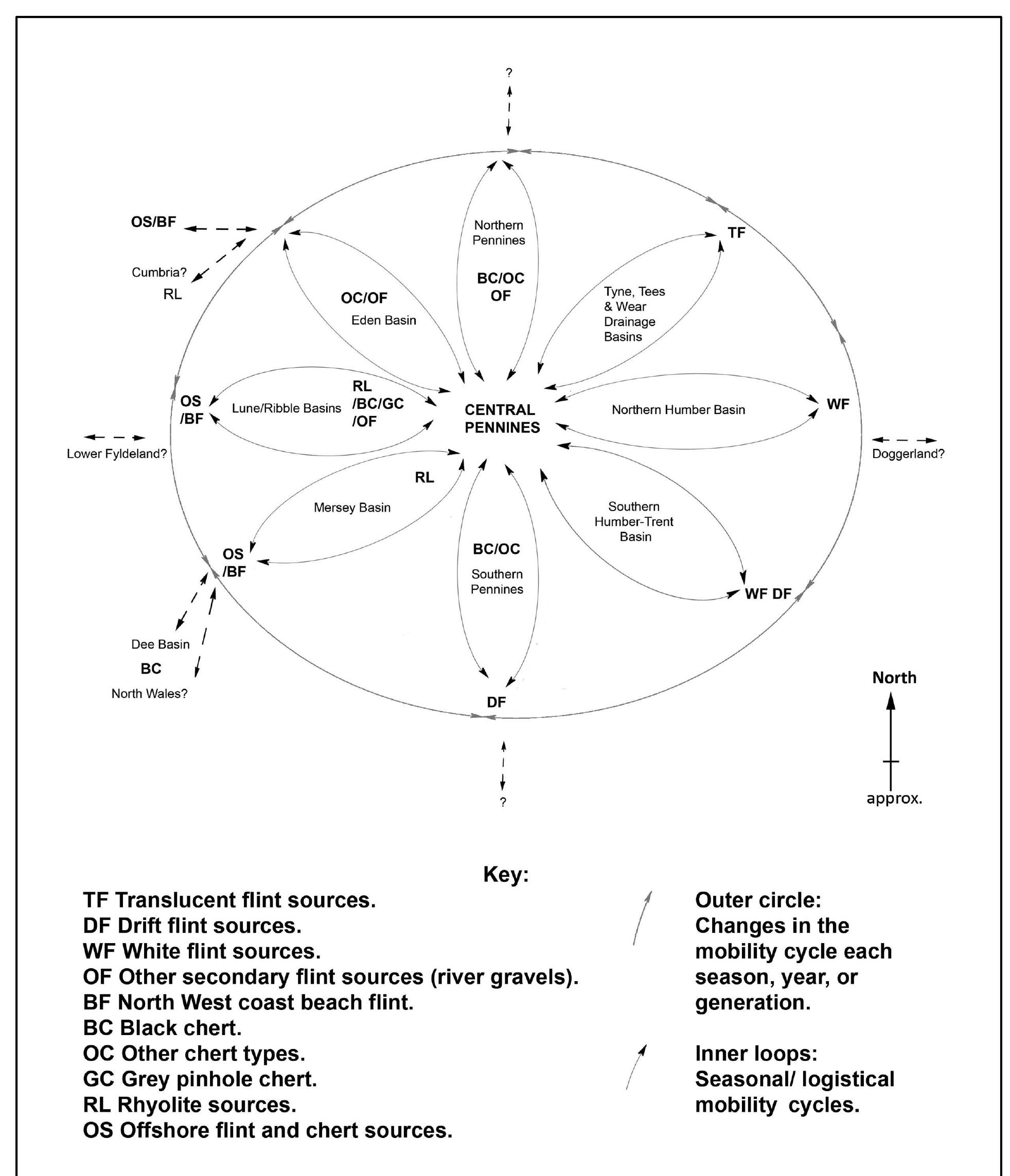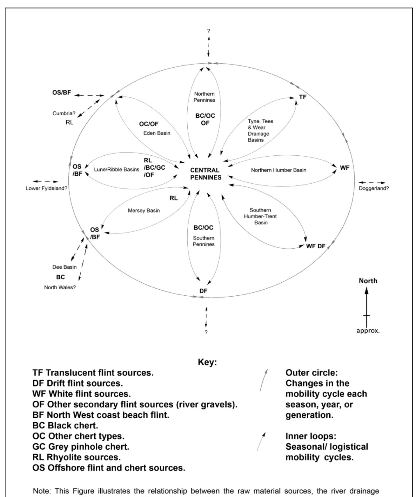 It also concludes that the lithics found on these persistent places were imported from a hinterland covering Northern England. This hinterland compares well with population density reconstructions and contains similar lithic styles (during the Early and Late Mesolithic). Consequently, this hinterland implies that mobility was from throughout Northern England, with the Pennines being a key node or the Nexus of increasingly logistical resource and mobility networks. It also posits that the hinterland may represent a band or a socio-ethnic/linguistic territory. This, therefore, challenges traditional east-west mobility models, and the suggestions of smaller separate interior and coastal social territories.